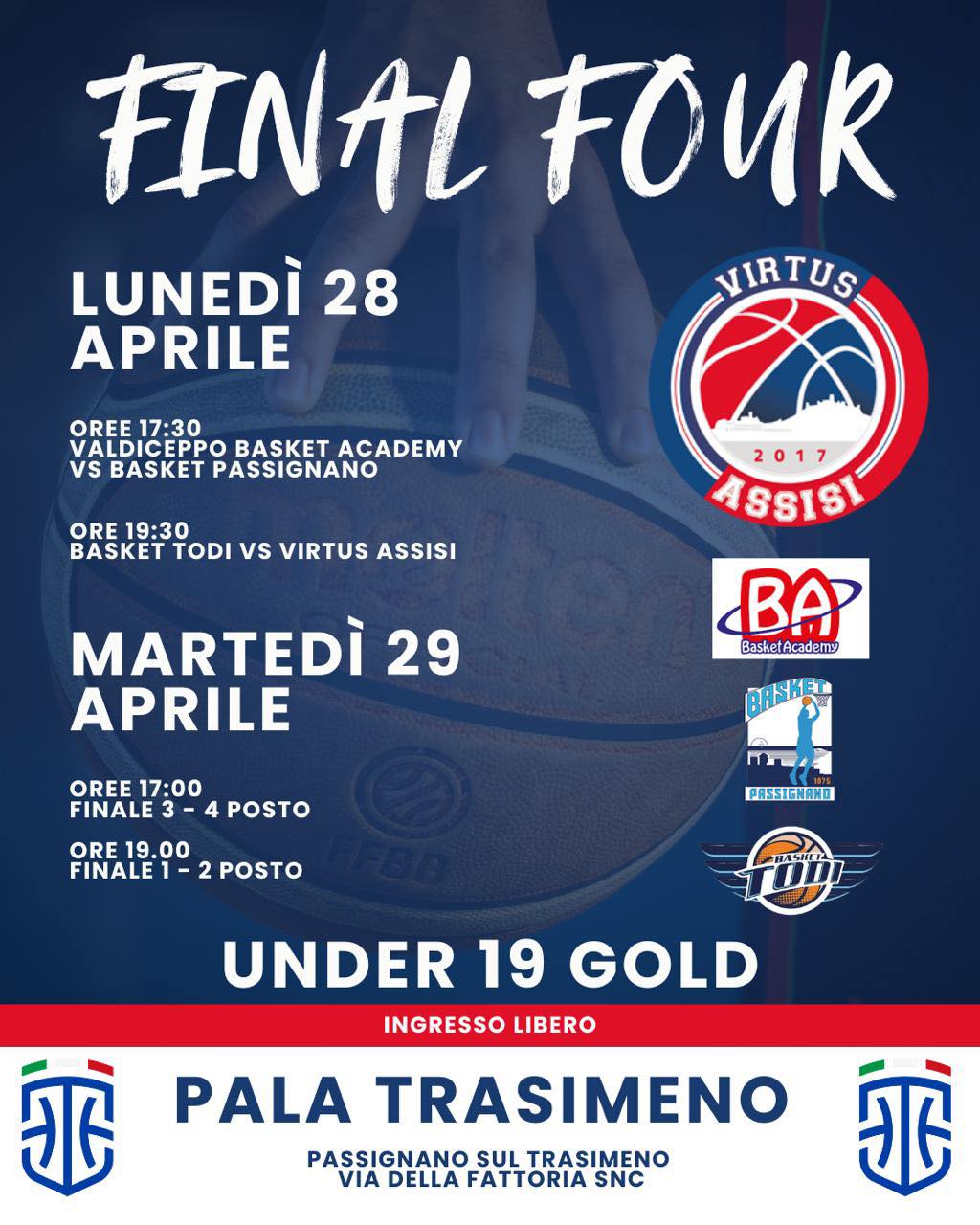 Grande attesa per la fase finale del campionato Under 19 Umbria. Nelle giornate di domani – lunedì 28 aprile – e di martedì 29 aprile si terranno le Final four del campionato Under 19 Gold. Un evento che si svolgerà presso il Pala Trasimento di Passignano e che sarà ad ingresso libero per chiunque voglia andare ad assistere alla due giorni di partite.