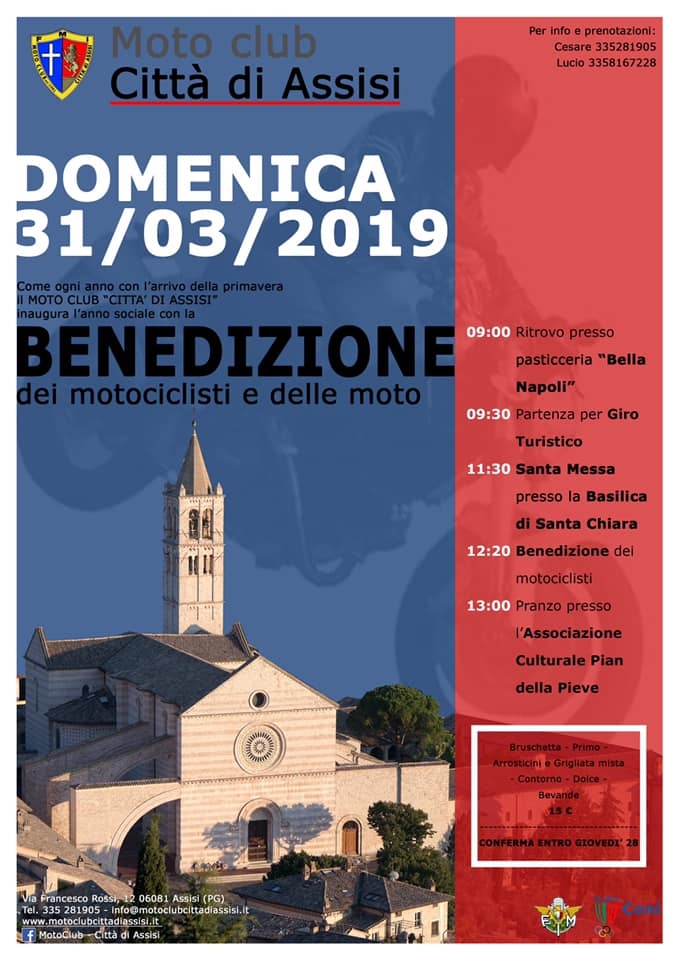 Come ogni anno, con l’arrivo della primavera, il Moto Club “Città di Assisi” inaugura l’anno sociale con la benedizione dei motociclisti e delle moto. Il tradizionale incontro è in programma per domenica 31 marzo.