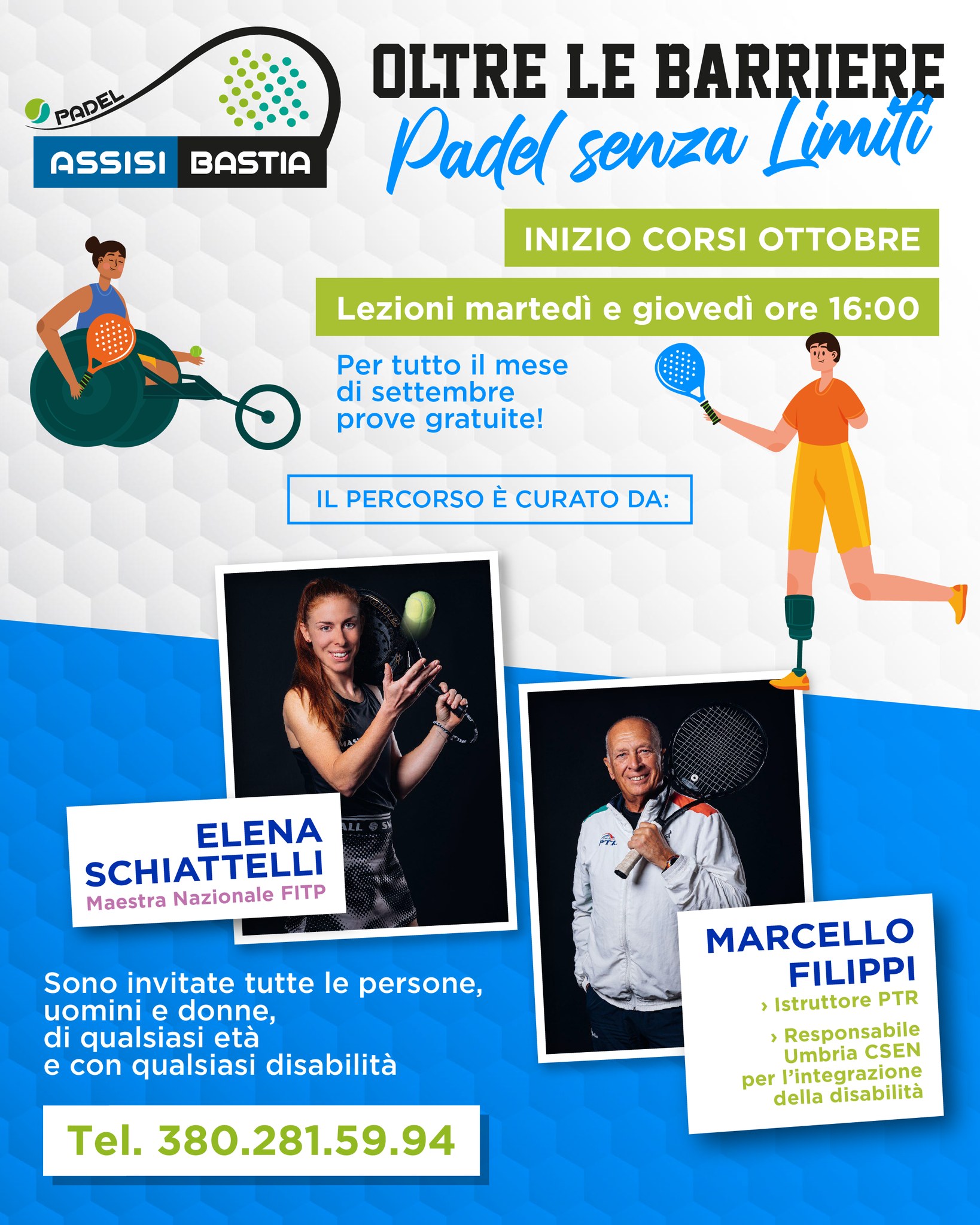 L’Assisi Bastia Padel invita tutte le persone di qualsiasi età e qualsiasi disabilità. Per maggiori informazioni chiamare il telefono il numero 3802815994.
