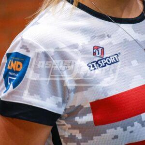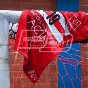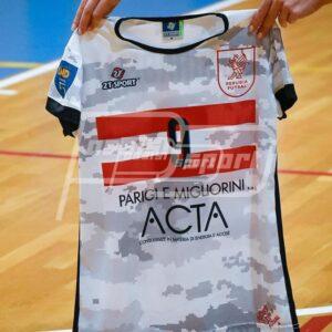 Seconda maglia bianca e rossa con dettagli neri, sempre camouflage pixel con sfumature in grigio chiaro. La terza maglia di colore nero con rifiniture nere e rosse. In questa nuova stagione anche i portieri avranno l’occasione di vestire il rosso, per la prima stagione nella storia del club. Le maglie del club, cucite a mano, sono state realizzate dall’azienda assisiate 2T Sport.