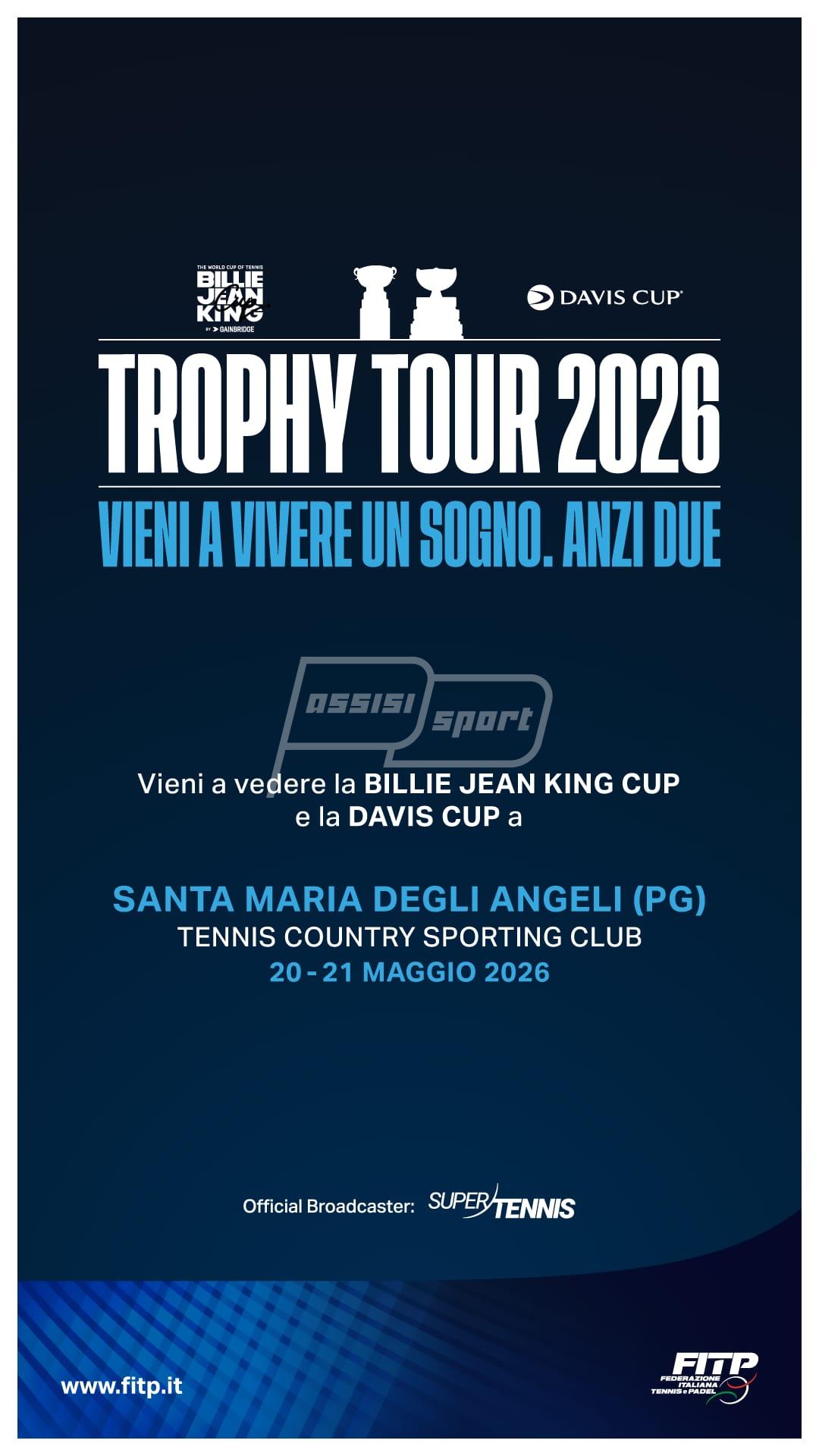 Una due giorni dal sapore internazionale per il territorio assisano. Il 20 e il 21 maggio 2026, infatti, a Santa Maria degli Angeli saranno esposte la Coppa Davis e la Billie Jean King Cup, i due massimi trofei del tennis mondiale sollevati, nelle scorse edizioni, dalle nazionali italiane maschile e femminile.