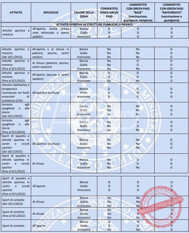 Dal sito Sport Governo la tabella con le attività consentite con green pass base o rafforzato in base al colore della Regione: