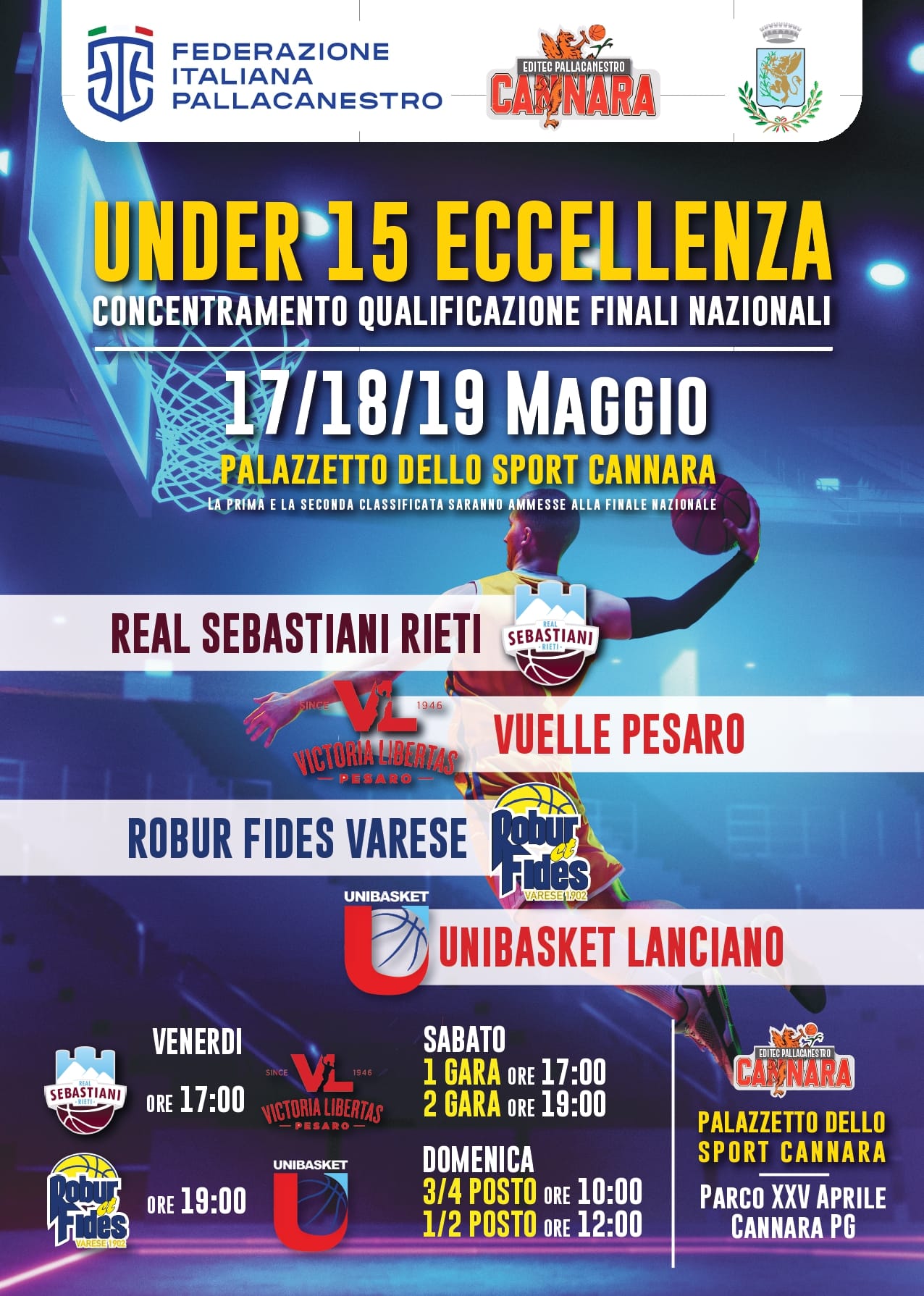 Sarà il palazzetto dello sport di Cannara ad ospitare il concentramento per la qualificazione alle finali nazionali della categoria Under 15 Eccellenza. Quattro eccellenze nazionali – le società Rieti,Pesaro, Varese e Lanciano – si affronteranno sul parquet di Cannara in una tre giorni che vedrà le compagini sfidarsi in partite ad alto tasso tecnico.