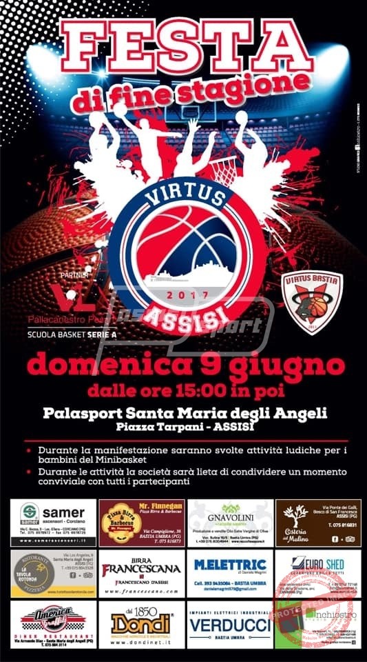 Si terrà domenica 9 giugno a partire dalle 15 al PalaSir di Santa Maria degli Angeli, la grande festa della Virtus Assisi per celebrare una stagione ricca di successi. Un’annata quella 2018/2019 che ha visto la Virtus Assisi vincere la regular-season del campionato di serie C Silver e guadagnare ai play-off, vinti anche quelli, la promozione per il prossimo campionato di serie C Gold.