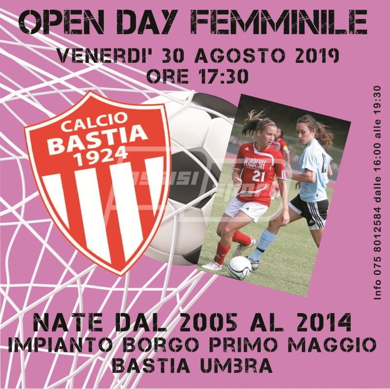 “Il Bastia Calcio organizza per venerdì 30 agosto 2019 alle ore 17.30 presso l’impianto sportivo di Borgo Primo Maggio l’Open Day Femminile rivolto a tutte le ragazze nate dal 2005 fino al 2014”. È quanto fa sapere la società biancorossa in una nota.
