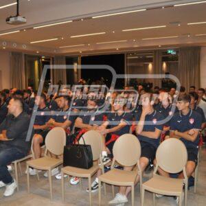 Tutti presenti, dal presidente Sandro Mammoli ai giocatori al gran completo, fino alla dirigenza, allo staff tecnico e alle massime cariche istituzionali cittadine, con il sindaco di Bastia Umbra Paola Lungarotti e l’assessore allo sport Filiberto Franchi.