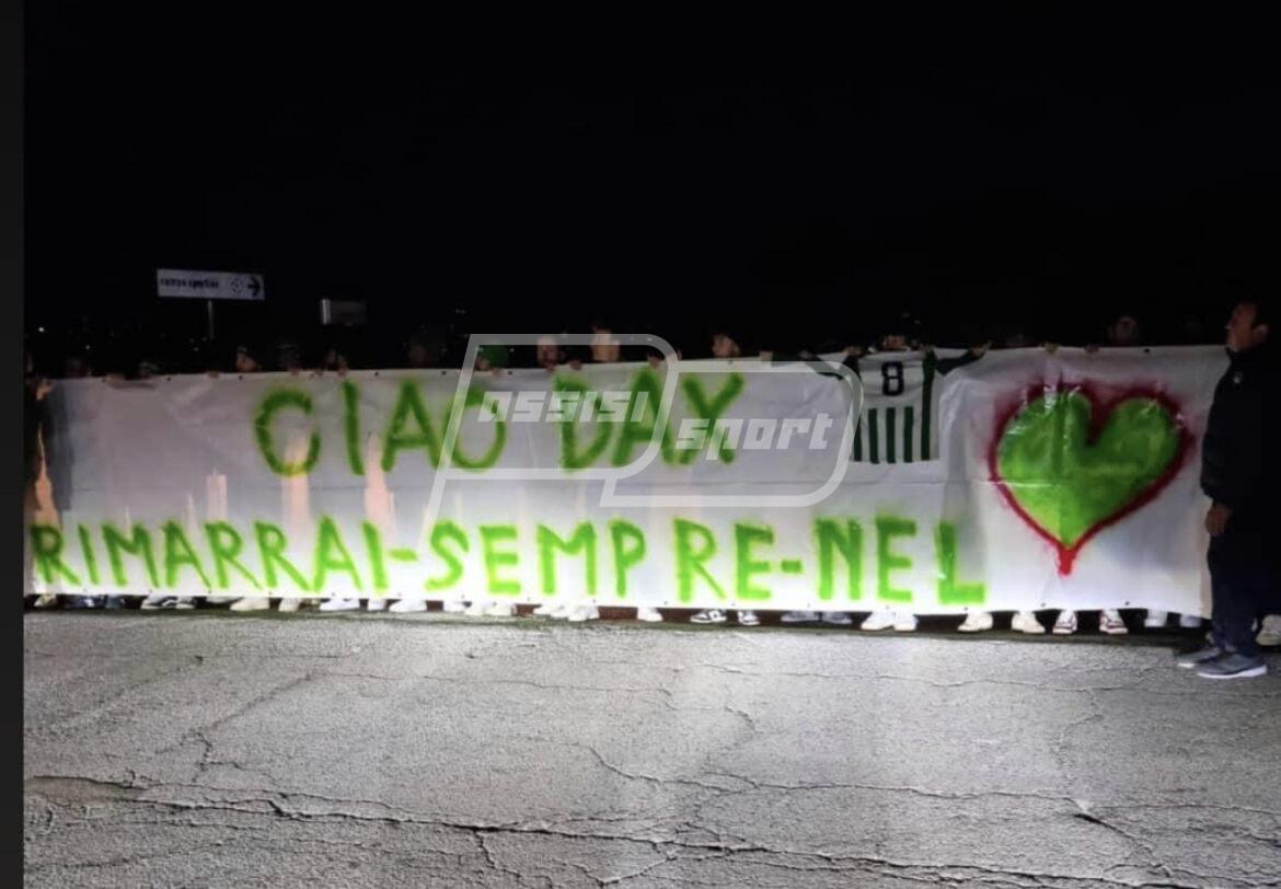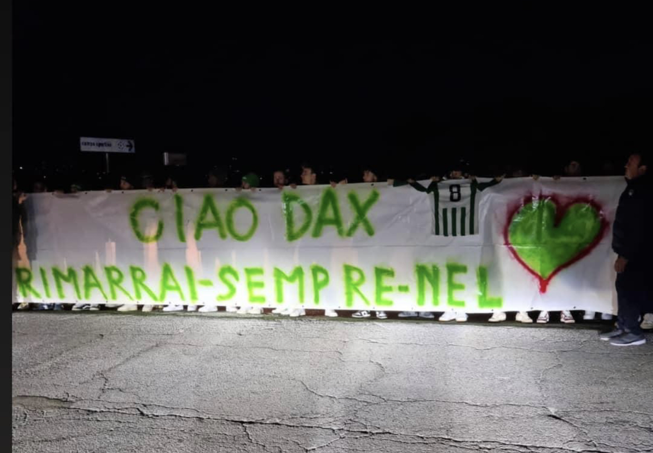 Il Viole Calcio tutto per Davide Piampiano. Dopo il rito funebre la società e i compagni di squadra hanno voluto salutare per l’ultima volta Davide esponendo uno striscione, sorretto da tutti davanti allo stadio. Quel campo, a Viole di Assisi, dove Davide, maglia numero 8 esposta insieme allo striscione, era protagonista di tante battaglie. “Ciao Dax, rimarrai sempre nel cuore” – la frase con i colori sociali bianco e verdi.