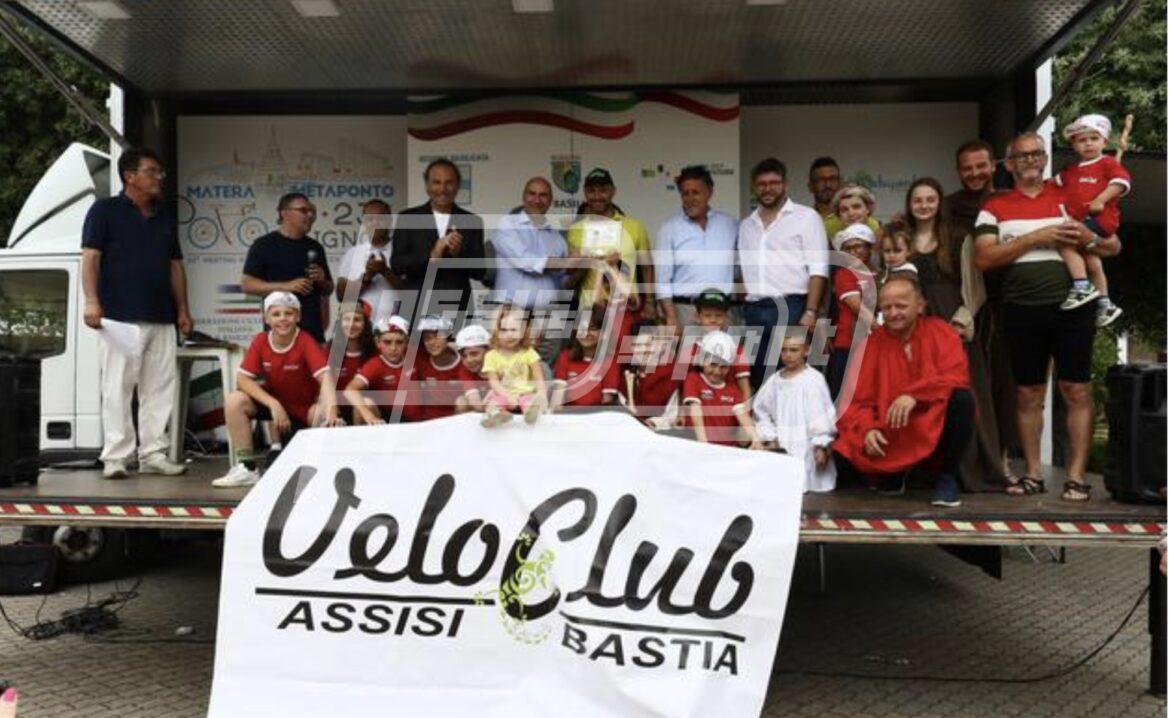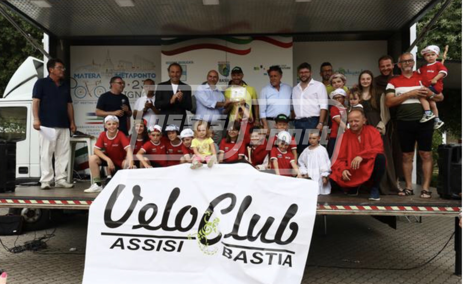 Meeting Nazionale dei Giovanissimi, terzo trionfo consecutivo della formazione umbra Velo Club Racing Assisi Bastia al Premio Franco Ballerini in occasione della sfilata cittadina nel centro di Matera. Una giuria tecnica ha proclamato la società sportiva più creativa e che ha messo meglio in evidenza il proprio territorio e la propria comunità: il Velo Club Racing Assisi Bastia ha rappresentato San Francesco d’Assisi e Gino Bartali, due simboli della religiosità e dello sport come “messaggeri di pace” a disposizione dei poveri e degli indifesi. Una strepitosa conferma che arriva dopo il grande successo nel 2017 a Porto Sant’Elpidio nelle Marche (Calendimaggio di Assisi) e nel 2018 ad Andalo in Trentino (fauna e flora delle Alpi). La squadra di Bastia Umbra ha ottenuto il maggior numero di punti (140). A recitare la rappresentazione sono stati Paolo Carrara Tarara nella doppia veste di San Francesco e Bartali accompagnato dai “frati” Stefano Baldelli e Lino Altea. Il piccolo Giacomo è stata la mascotte della rappresentazione insieme a Mattia Proietti Gagliardoni che ha portato la bici a Tarara (Bartali) mettendo in scena il famoso trasporto dei documenti falsi degli ebrei all’interno della canna della bici ai tempi dell’occupazione tedesca in Italia.