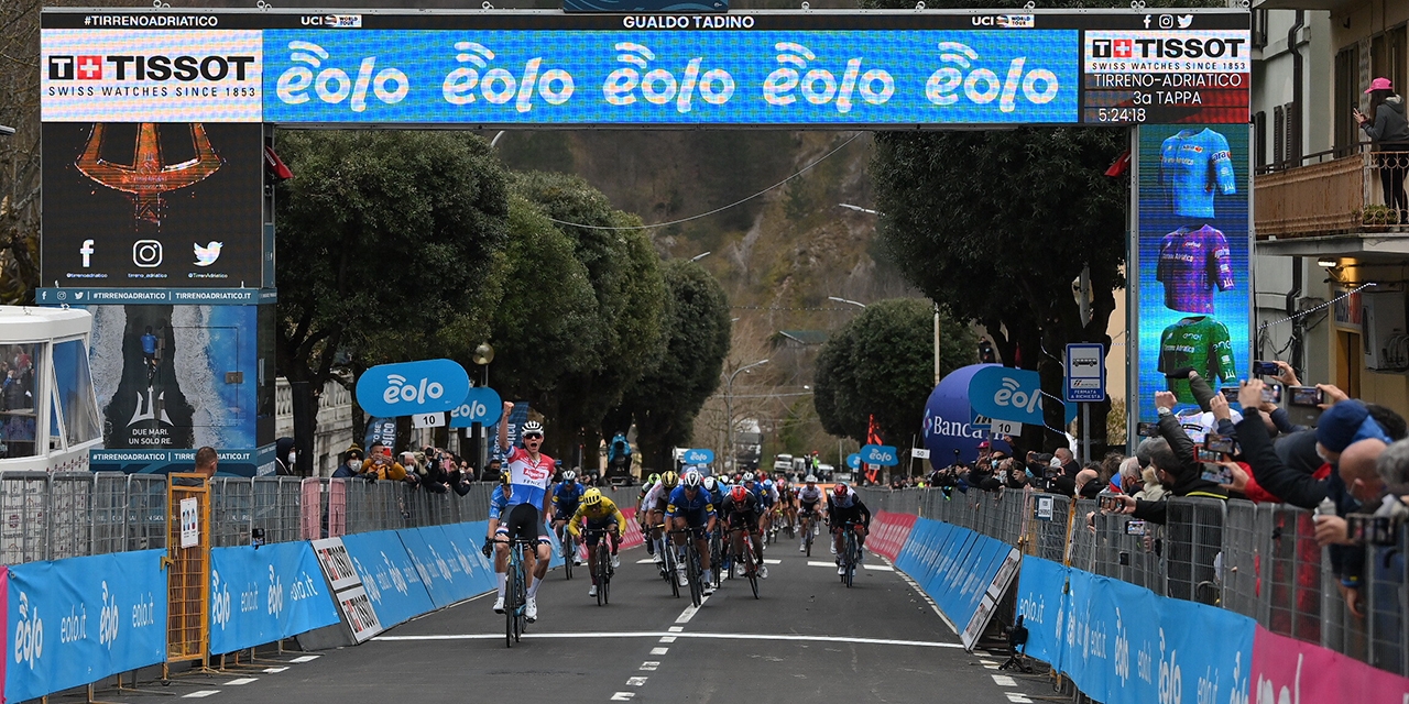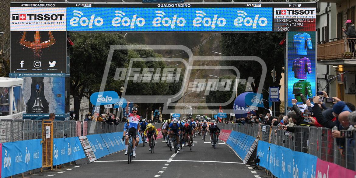 Mathieu van der Poel (Alpecin-Fenix) ha vinto la terza tappa della Tirreno-Adriatico Eolo, da Monticiano a Gualdo Tadino (219 km). Sul traguardo ha preceduto Wout van Aert (Team Jumbo-Visma) e Davide Ballerini (Deceuninck – Quick Step). Wout van Aert è ancora in Maglia Azzurra. Bello il assaggio a Mocaiana, Gubbio e Branca nel primo pomeriggio. Mathieu van der Poel ha poi alzato al cielo le braccia sul traguardo di Gualdo Tadino.