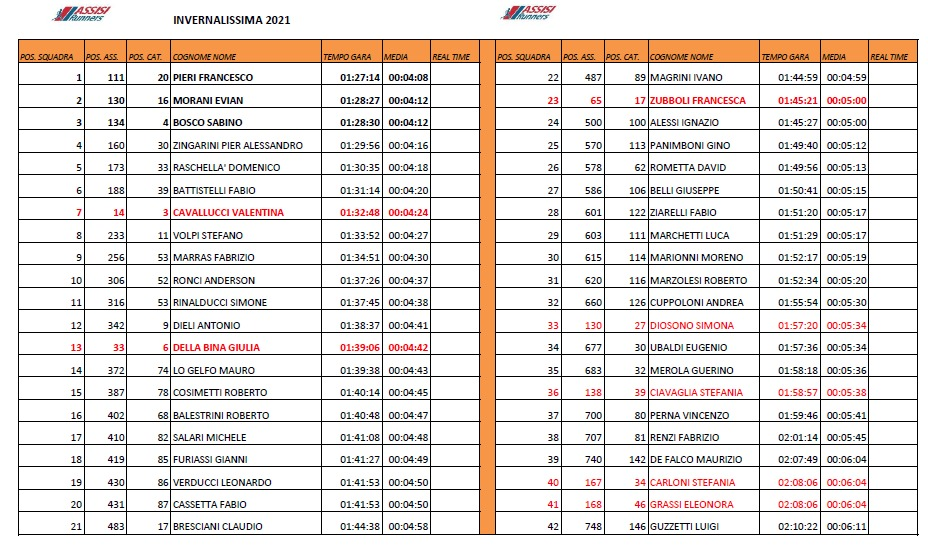 In campo femminile, ancora una prova strepitosa di Silvia Tamburi (foto nella gallery) che ha vinto anche il Memorial Giuseppe Conforto. La portacolori dell’Avis Perugia ha chiuso al secondo posto centrando il personal best sulla distanza. La Tamburi chiude con un tempo mostruoso in 1°16’47’’. Si migliora di 2 minuti e 40 secondi e per una manciata di secondi (11), non ha eguagliato il record detenuto da Costanza Martinetti, che aveva vinto l’ultima edizione dell’Invernalissima, disputata nel 2019. A chiudere il podio femminile, Paola Garinei, ancora dell’Avis Perugia.