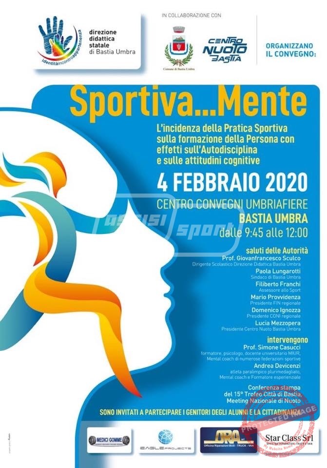 La Direzione Didattica di Bastia Umbra, nell’ambito di una sensibilizzazione dei giovani nei confronti dell’importanza dell’attività sportiva e della sua ripercussione positiva in ambito educativo e formativo, organizza, in collaborazione con il Centro Nuoto Bastia ed il Comune di Bastia Umbra, il Convegno “Sportiva…Mente” presso il Centro Convegni dell’Umbriafiere nella mattinata di martedì 4 febbraio 2020, dalle ore 9:15 alle ore 12:45 circa.
