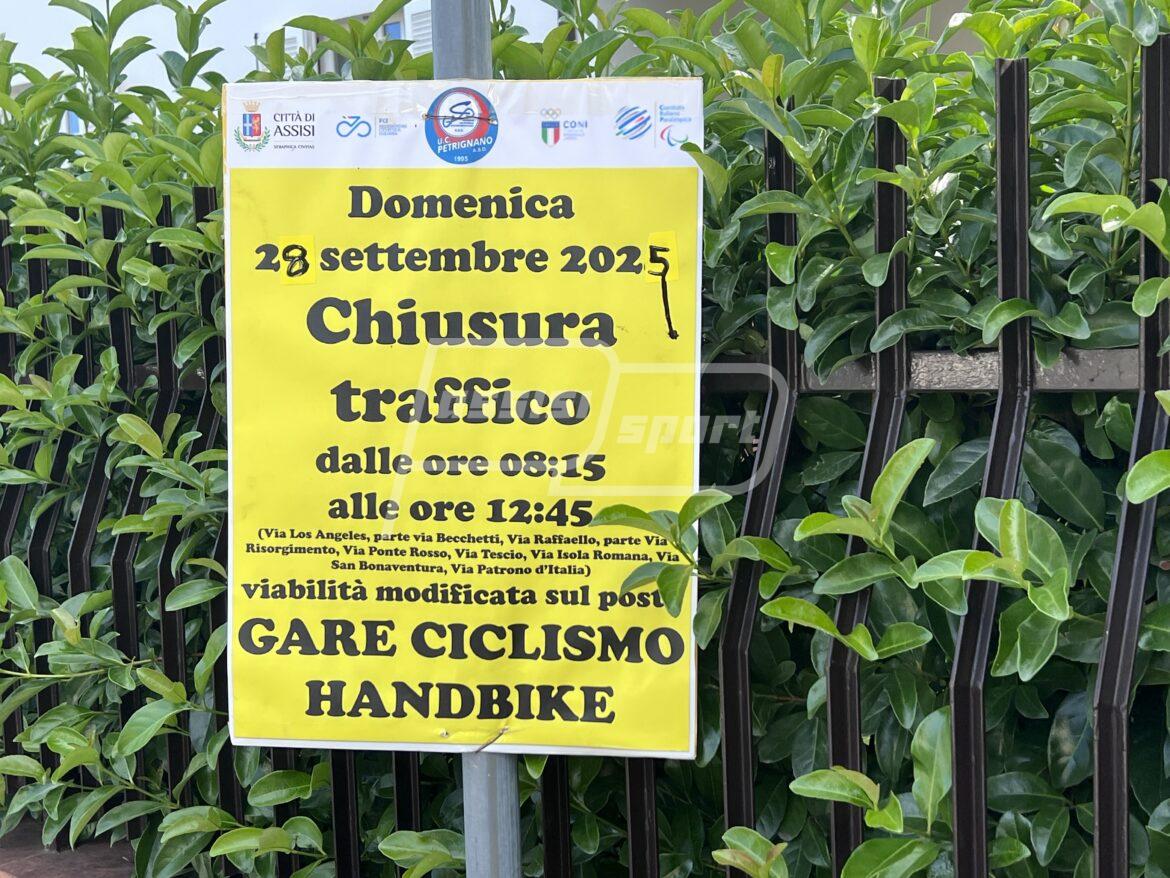 Modifiche alla viabilità ad Assisi, il 28 settembre 2025, in occasione del campionato italiano per società di Handbike, gara ciclistica riservata ad atleti paralimpici. L’evento, organizzato dall’Unione Ciclistica Petrignano, si terrà a Santa Maria degli Angeli, su strade comunali, con partenza alle ore 9.00 e arrivo intorno alle 12.15. Al fine di garantire lo svolgimento in sicurezza della manifestazione, con apposita ordinanza, la Polizia locale di Assisi ha disposto una serie di provvedimenti, finalizzati a limitare o sospendere la circolazione in alcune vie.