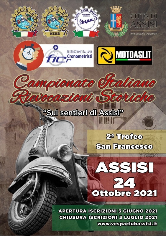 Aprono ufficialmente giovedì 3 giugno alle ore 20.00 le le iscrizioni alla 1º Rievocazione Storica organizzata dal Vespa Club Assisi. L’evento si terrà il prossimo 24 ottobre e farà parte del Campionato italiano Rievocazioni Storiche “Sui Sentieri di Assisi” 2º Trofeo San Francesco.