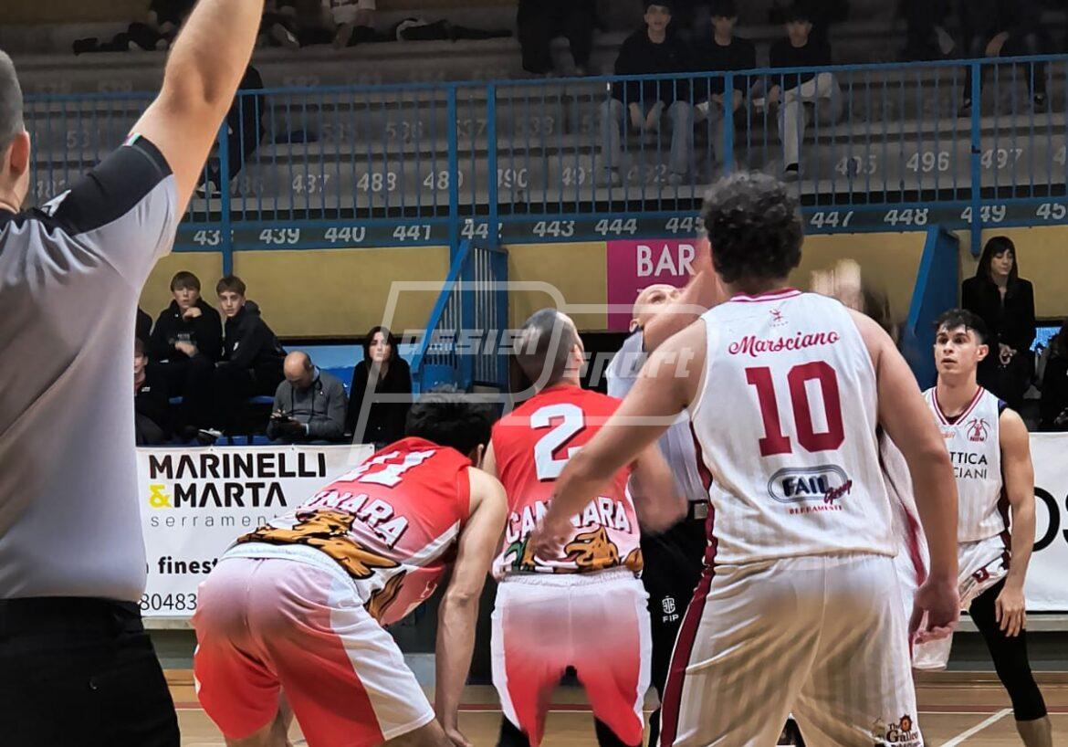 Nel primo tempo Marsciano prende subito il controllo della partita e allunga fin dai primi minuti sul Cannara che nonostante vari tentativi chiude il primo quarto sotto di dieci punti. Nella seconda Frazione, invece, si assiste ad una sfida punto a punto, ma con i padroni di casa che gestiscono al meglio gli avversari e arrivano all’intervallo lungo sul 44 a 36.