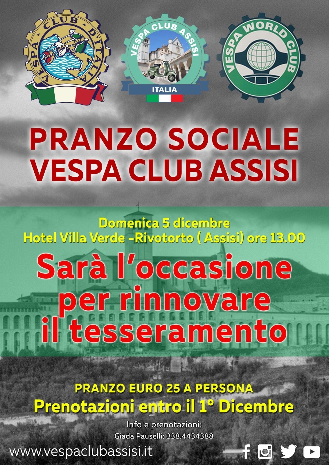 “Durante il pranzo – fanno sapere dal Vespa Club Assisi – si farà il punto dell’anno vespistico appena trascorso e si illustreranno gli impegni per il 2022. Il Consiglio direttivo aspetta tutti i soci per questo importante momento conviviale e ricorda di dare la propria adesione entro il 1 dicembre contattando la presidente Giada Pauselli”.