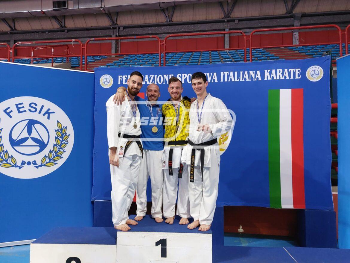 Bella prestazione anche per Massimo Quacquarini che nella sua numerosa categoria si fa avanti fino a fermarsi in semifinale, ed è per lui medaglia di bronzo. Non da meno Leonardo Gaspardis che ai suoi primi campionati italiani raggiunge il terzo gradino del podio. Anche il seniores Federico Belloni è medaglia di bronzo, uno dei pochi karateka a portare avanti negli anni sia la specialità del kata che del kumite.