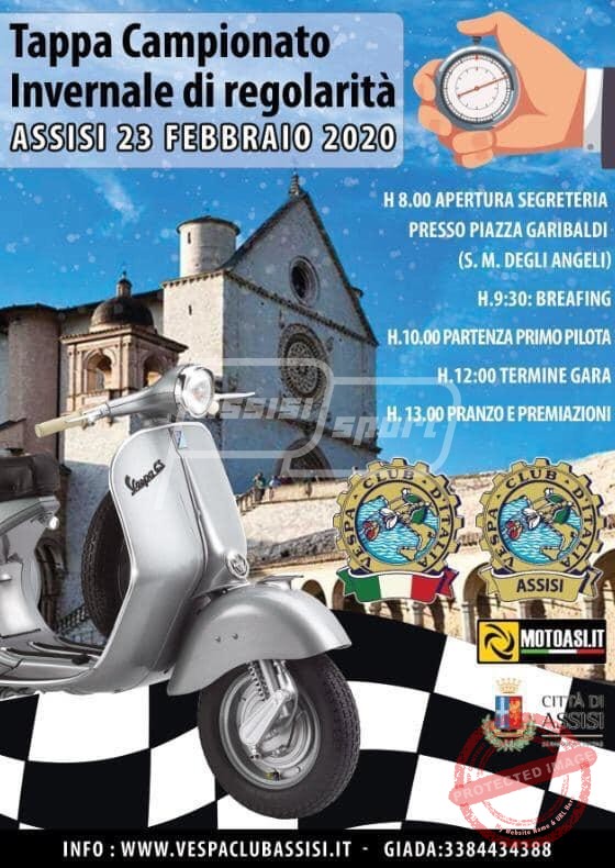 Motori, tantissime Vespa nuovamente ad Assisi. Si terrà infatti a Santa Maria degli Angeli, domenica 23 Febbraio, la terza tappa del Campionato Invernale di Regolarità per il centro Italia al quale parteciperanno i migliori regolaristi italiani. L’evento organizzato da Vespa Club d’Italia e Vespa Club Assisi, con il patrocinio della Città di Assisi e la collaborazione di MotoAsi.it.