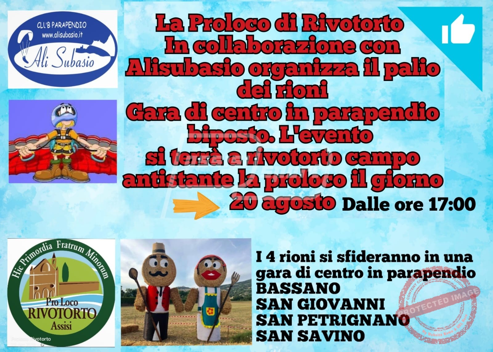 Grande appuntamento oggi sabato 20 agosto alle 17 a Rivotorto di Assisi con Ali Subasio Paragliding Club e Pro Loco Rivotorto in occasione della 33ª Rassegna Antichi Sapori.