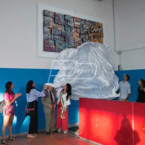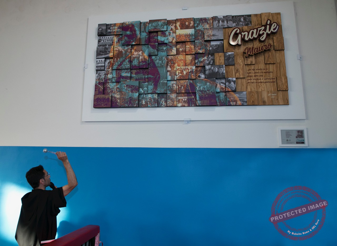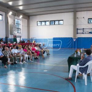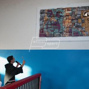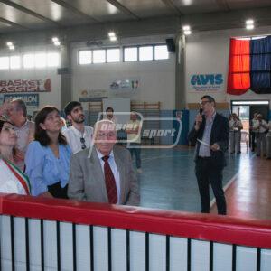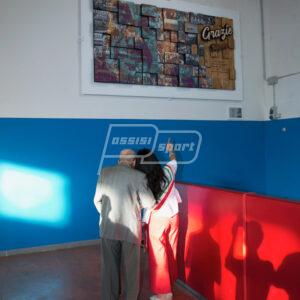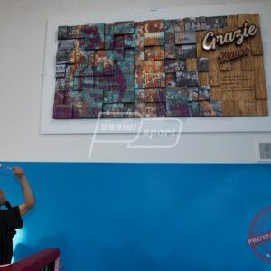 È toccato poi all’artista Eraldo Marini che ha spiegato l’opera – che è stata appesa proprio all’ingresso del palazzetto – realizzata da lui in stile artistico moderno e che riporta tante immagini di Mauro Venarucci inserito pienamente nella vita sportiva e sociale del paese e la scritta “Grazie Mauro”. (Continua dopo la foto)