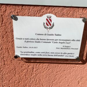 Lo Stadio Comunale Carlo Angelo Luzi di Gualdo Tadino nella giornata di sabato 14 Ottobre è stato riconsegnato alla città. Alla riapertura dell’impianto erano presenti l’Amministrazione Comunale guidata dal Sindaco, Massimiliano Presciutti, il Presidente del Coni Umbria, Domenico Ignozza, il Consigliere della FIGC Umbria, Simone Ortenzi ed il Capitano della compagnia dei Carabinieri di Gubbio, Fabio Del Sette.