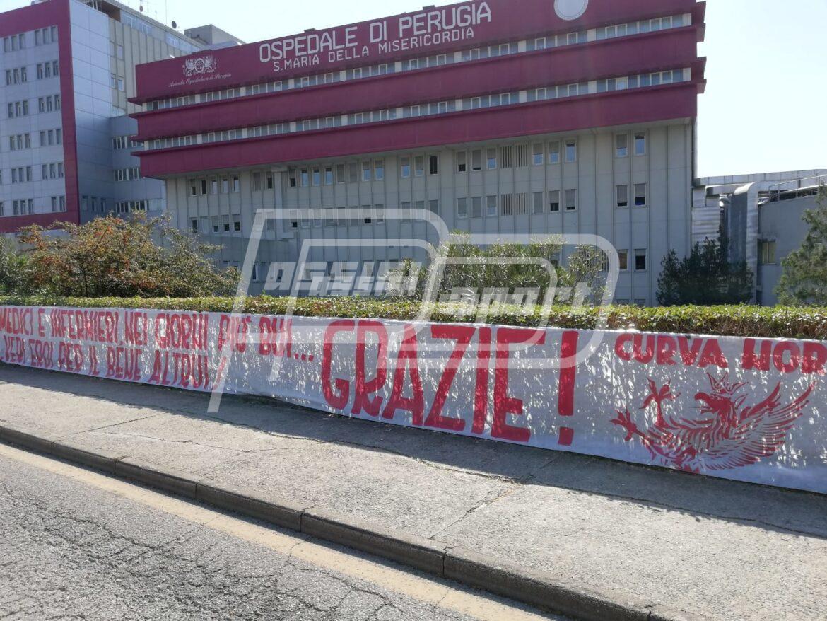 Uno striscione, firmato “Curva Nord”, è stato esposto all’ingresso del S.Maria della Misericordia per testimoniare vicinanza e fiducia nei confronti degli operatori sanitari impegnati “ nella partita più difficile” come l’ha definita Ilario Castagner che ha voluto ricordare in un video le competenze di medici ed infermieri quando qualche anno fa venne sottoposto ad un intervento chirurgico al cuore. “ Tifiamo per voi per vincere la partita più importante “, ha sottolineato Castagner. Ora si aggiungono agli apprezzamenti dell’allenatore del “Perugia dei miracoli”, anche quelli dei tifosi del grifo, che definiscono “eroi” chi mette a repentaglio la propria vita per salvare quella degli altri.
