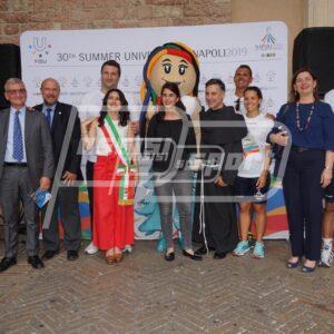 In conclusione la foto di rito con gli atleti, gli organizzatori e Partenope, la mascotte ufficiale delle Universiadi 2019.