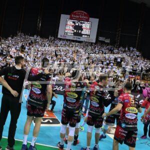 Atanasijevic e Leon guidano Perugia in avvio di terza frazione. L’ace di De Cecco segna 9-4 sul tabellone del PalaBarton, poi a bersaglio Berger (10-4). Anche l’ace per il martello austriaco (12-5). Servizio vincente anche per Dzavoronok (12-7). Pallonetto vincente per Plotnytskyi che poi si ripete in diagonale (14-11). Leon scoppia il pallone per la pipe del 17-12. Ace di Ricci, Perugia scappa via (19-12). L’ace di Berger avvicina i Block Devils al traguardo (22-15). Il muro di Ricci porta Perugia al match point (24-17). Muro di De Cecco, il PalaBarton esplode in un boato! (25-17).