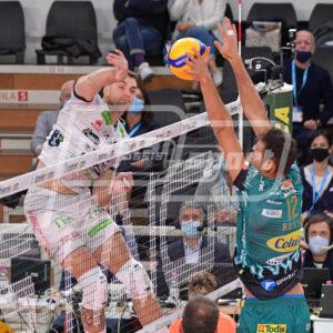 Terzo set con Solè a terra in primo tempo (3-4). Out Kooy, poi muro e contrattacco di Leon (4-8). Mette anche l’ace Leon (6-11). Due in fila di Kooy, poi muro di Lucarelli (9-11). Perugia riparte con Plotnytskyi (9-13). Smash di Solè (11-16). Muro di Russo, poi out Kooy (13-20). Ace di Leon (14-22). Muro di Russo (15-23). Plotnytskyi porta i suoi al set point (16-24). L’errore al servizio di Giannelli manda avanti Perugia (17-25). Quarto set con Ter Horst a bersaglio (3-4). Il muro di Lisinac capovolge (5-4). Punto di Nimir (6-4). Ace di Lucarelli, poi maniout di Kooy (9-5). Podrascanin in primo tempo (13-8). Muro vincente di Russo (13-10). Muro anche per Solè (14-12). Trento riprende vigore con Lisinac (16-12). Nimir rimanda Perugia a -5 (18-13). Ace di Plotnytskyi (18-15). Leon in contrattacco, poi ace di Solè (19-18). Ace di Leon e parità (21-21). Out Nimir (22-23). Lisinac pareggia (23-23). Punto di Oleh e match point Perugia (23-24). In rete Ter Horst (24-24). Maniout di Kooy (25-24). Solè non ci sta (25-25). Invasione di Giannelli (25-26). Ace di Plotnytskyi e Perugia espigna la BLM Group Arena (25-27).